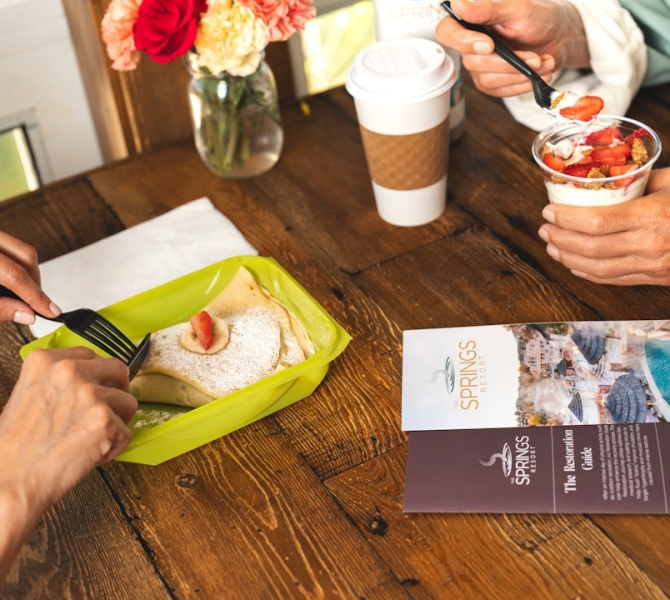 I have fruit for breakfast, and sometimes I’ll treat myself to something from Two Chicks and a Hippie or a breakfast bagel sandwich from Boulders Café. I always do stretching and breathing exercises before heading into town. After a car accident I had, The Springs have become an integral part of my own wellness routine. Soaking alleviates my neck and shoulder pain, so I am at The Springs a lot. Supplementing my soaking with marijuana and THC salve also helps.